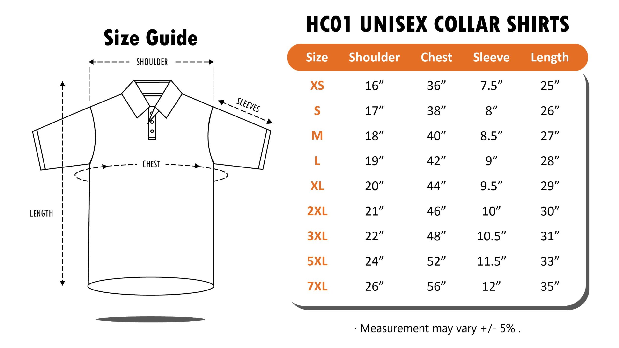 Size | XS, S, M, L, XL, 2XL, 3XL, 5XL, 7XL |